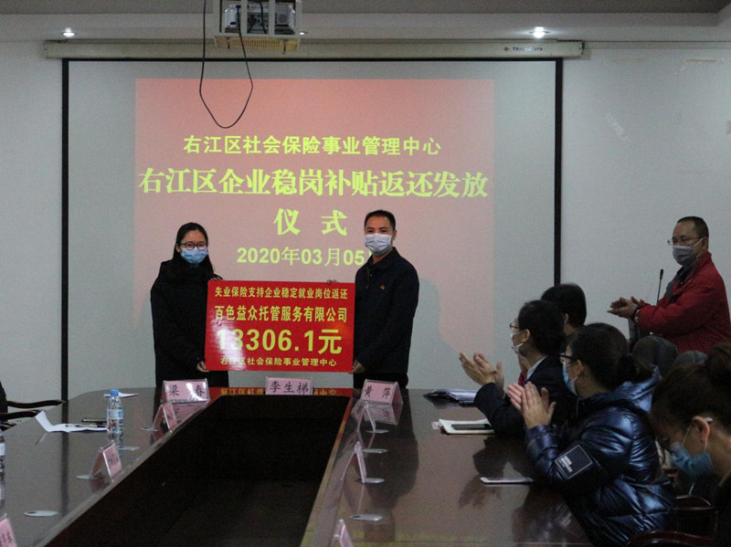??? 3月5日,在右江區(qū)社會保險事業(yè)管理中心召開穩(wěn)崗補貼返還工作會議暨企業(yè)穩(wěn)崗補貼返還發(fā)放儀式,我公司作為首批返還企業(yè)代表之一應(yīng)邀參加,會上社保中心主任李生梯對我公司響應(yīng)穩(wěn)崗補貼政策給予高度肯定,期望通過穩(wěn)崗補貼返還為公司的穩(wěn)定復(fù)產(chǎn)助力。截止目前,我公司有8家子公司符合享受失業(yè)保險穩(wěn)崗返還補貼條件,獲得穩(wěn)崗返還補貼3.6萬元,惠及企業(yè)員工約150人。(通訊員:黃 芬)