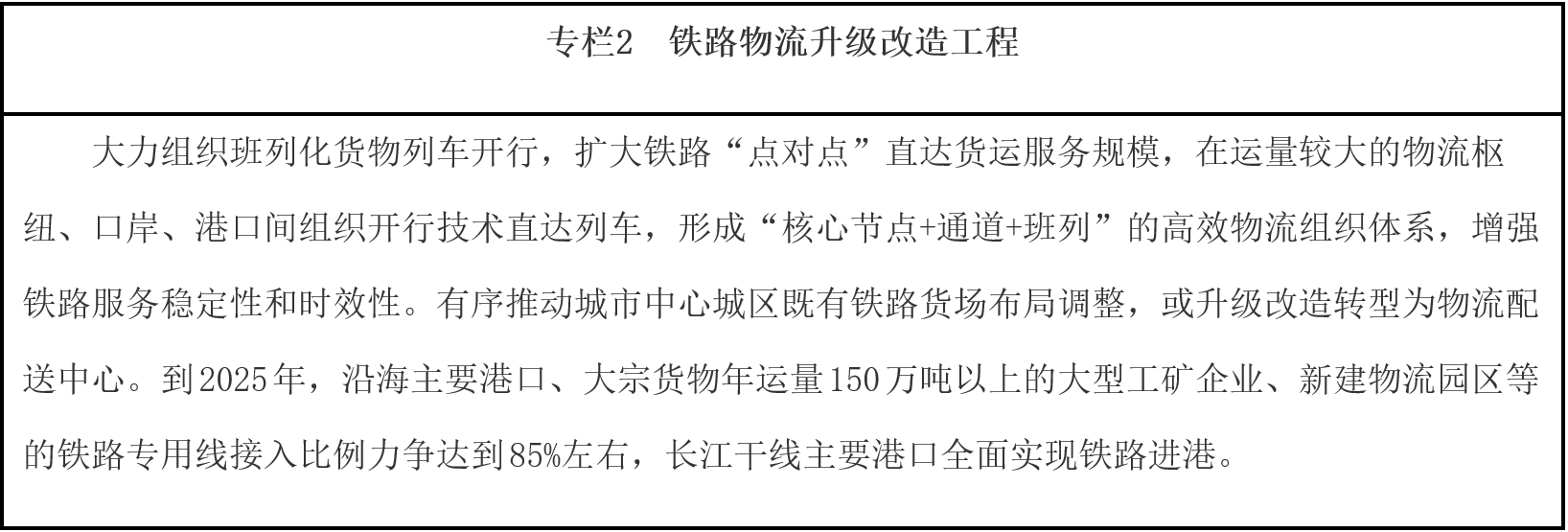 推進(jìn)結(jié)構(gòu)性降成本。加快推進(jìn)鐵路專用線進(jìn)港區(qū)、連園區(qū)、接廠區(qū),合理有序推進(jìn)大宗商品等中長(zhǎng)距離運(yùn)輸“公轉(zhuǎn)鐵”、“公轉(zhuǎn)水”。完善集裝箱公鐵聯(lián)運(yùn)銜接設(shè)施,鼓勵(lì)發(fā)展集拼集運(yùn)、模塊化運(yùn)輸、“散改集”等組織模式,發(fā)揮鐵路干線運(yùn)輸成本低和公路網(wǎng)絡(luò)靈活優(yōu)勢(shì),培育有競(jìng)爭(zhēng)力的“門到門”公鐵聯(lián)運(yùn)服務(wù)模式,降低公鐵聯(lián)運(yùn)全程物流成本。統(tǒng)籌沿海港口綜合利用,提升大型港口基礎(chǔ)設(shè)施服務(wù)能力,提高碼頭現(xiàn)代化專業(yè)化規(guī)?;?,加快推進(jìn)鐵水聯(lián)運(yùn)銜接場(chǎng)站改造,提高港口鐵路專用線集疏網(wǎng)絡(luò)效能,優(yōu)化作業(yè)流程。完善內(nèi)河水運(yùn)網(wǎng)絡(luò),統(tǒng)籌江海直達(dá)、江海聯(lián)運(yùn)發(fā)展,發(fā)揮近海航線、長(zhǎng)江水道、珠江水道等水運(yùn)效能,穩(wěn)步推進(jìn)貨物運(yùn)輸“公轉(zhuǎn)水”。推進(jìn)鐵水聯(lián)運(yùn)業(yè)務(wù)單證電子化,促進(jìn)鐵路、港口信息互聯(lián),實(shí)現(xiàn)鐵路現(xiàn)車、裝卸車、貨物在途、到達(dá)預(yù)確報(bào)以及港口裝卸、貨物堆存、船舶進(jìn)出港、船期艙位預(yù)定等鐵水聯(lián)運(yùn)信息交換共享。支持港口、鐵路場(chǎng)站加快完善集疏運(yùn)油氣管網(wǎng),有效對(duì)接石化等產(chǎn)業(yè)布局,提高管道運(yùn)輸比例。