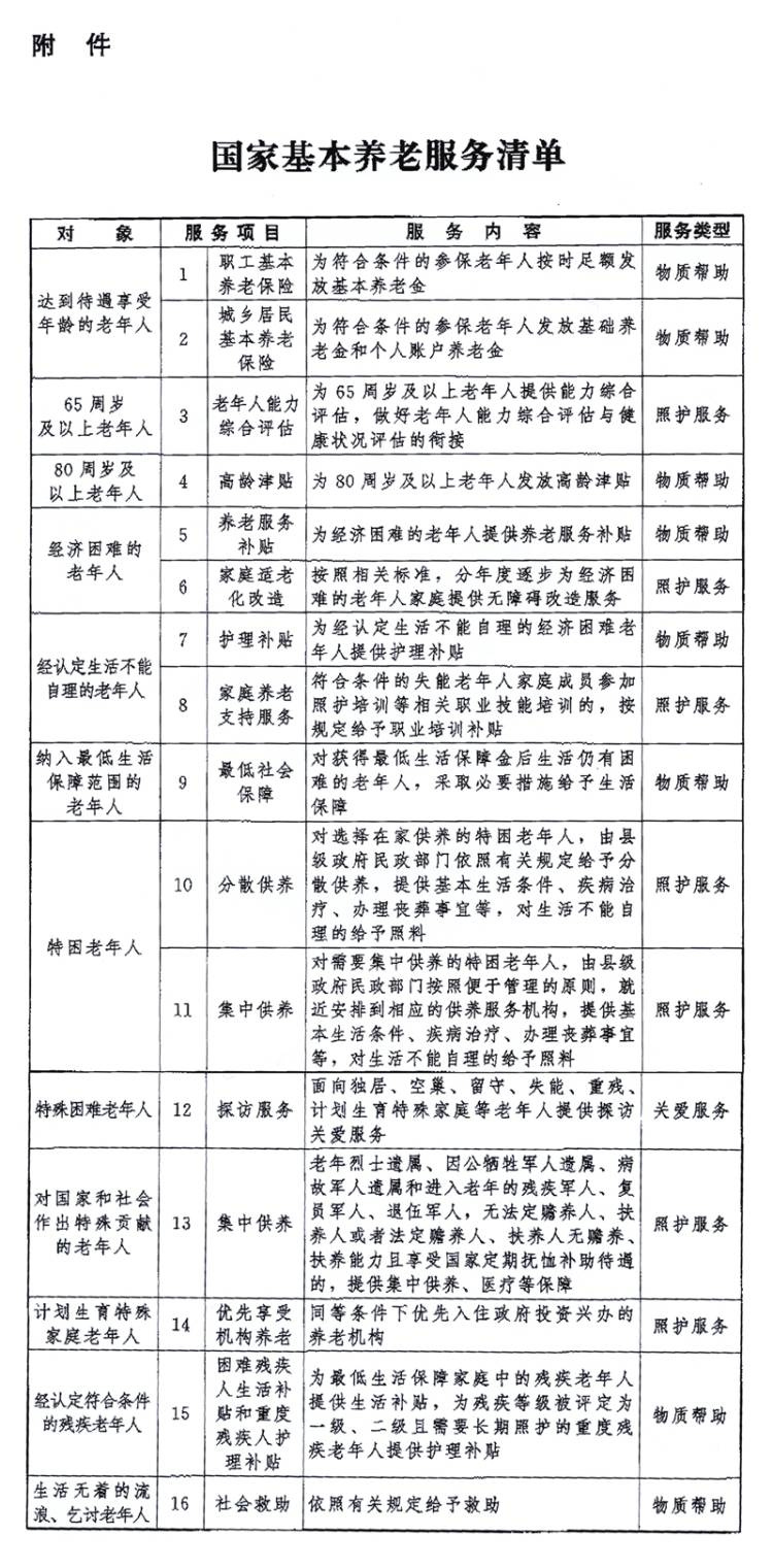 (一)制定落實基本養(yǎng)老服務清單。各地區(qū)各有關(guān)部門要嚴格落實《國家基本養(yǎng)老服務清單》(見附件)?!秶一攫B(yǎng)老服務清單》明確的對象、項目、內(nèi)容等,根據(jù)經(jīng)濟社會發(fā)展水平、財力狀況等因素動態(tài)調(diào)整,由民政部會同相關(guān)部門適時提出修訂意見,按程序報批后以部門名義印發(fā)實施。省級政府應當對照《國家基本養(yǎng)老服務清單》制定并發(fā)布本地區(qū)基本養(yǎng)老服務具體實施方案及清單,明確具體服務對象、內(nèi)容、標準等,其清單應當包含《國家基本養(yǎng)老服務清單》中的服務項目,且覆蓋范圍和實現(xiàn)程度不得低于《國家基本養(yǎng)老服務清單》要求。到2025年,基本養(yǎng)老服務制度體系基本健全,基本養(yǎng)老服務清單不斷完善,服務對象、服務內(nèi)容、服務標準等清晰明確,服務供給、服務保障、服務監(jiān)管等機制不斷健全,基本養(yǎng)老服務體系覆蓋全體老年人。