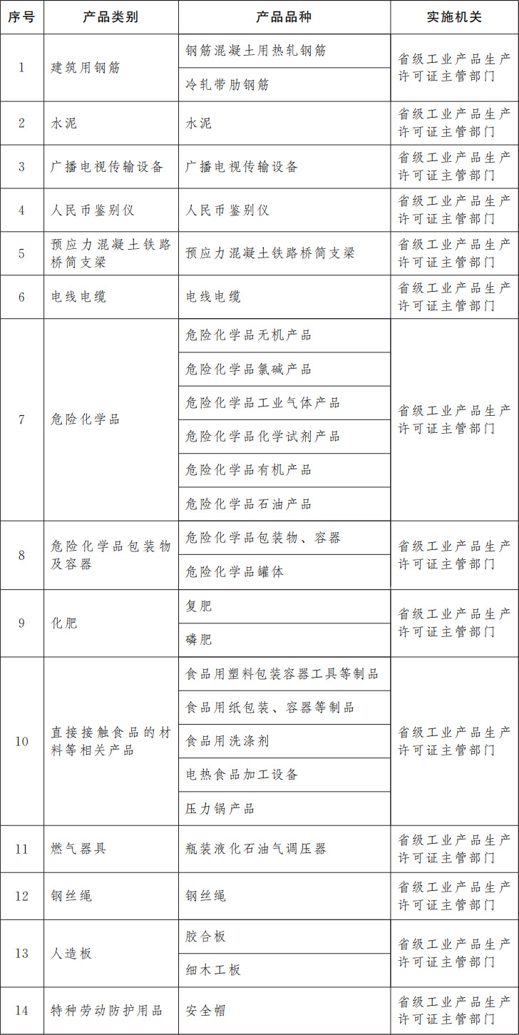 為保障重要工業(yè)產(chǎn)品質(zhì)量安全,強化產(chǎn)品準(zhǔn)入管理和源頭治理,防范產(chǎn)品質(zhì)量安全重大風(fēng)險,確保人民群眾生命財產(chǎn)安全和公共安全,國務(wù)院決定,調(diào)整完善工業(yè)產(chǎn)品生產(chǎn)許可證管理目錄,對冷軋帶肋鋼筋、瓶裝液化石油氣調(diào)壓器、鋼絲繩、膠合板、細木工板、安全帽等6種產(chǎn)品實施工業(yè)產(chǎn)品生產(chǎn)許可證管理。調(diào)整后,實施工業(yè)產(chǎn)品生產(chǎn)許可證管理的產(chǎn)品共計14類27個品種,由省級工業(yè)產(chǎn)品生產(chǎn)許可證主管部門負責(zé)實施,相關(guān)審批權(quán)限不得下放。同時,化肥生產(chǎn)許可證審批方式由告知承諾調(diào)整為“先核后證”審批。