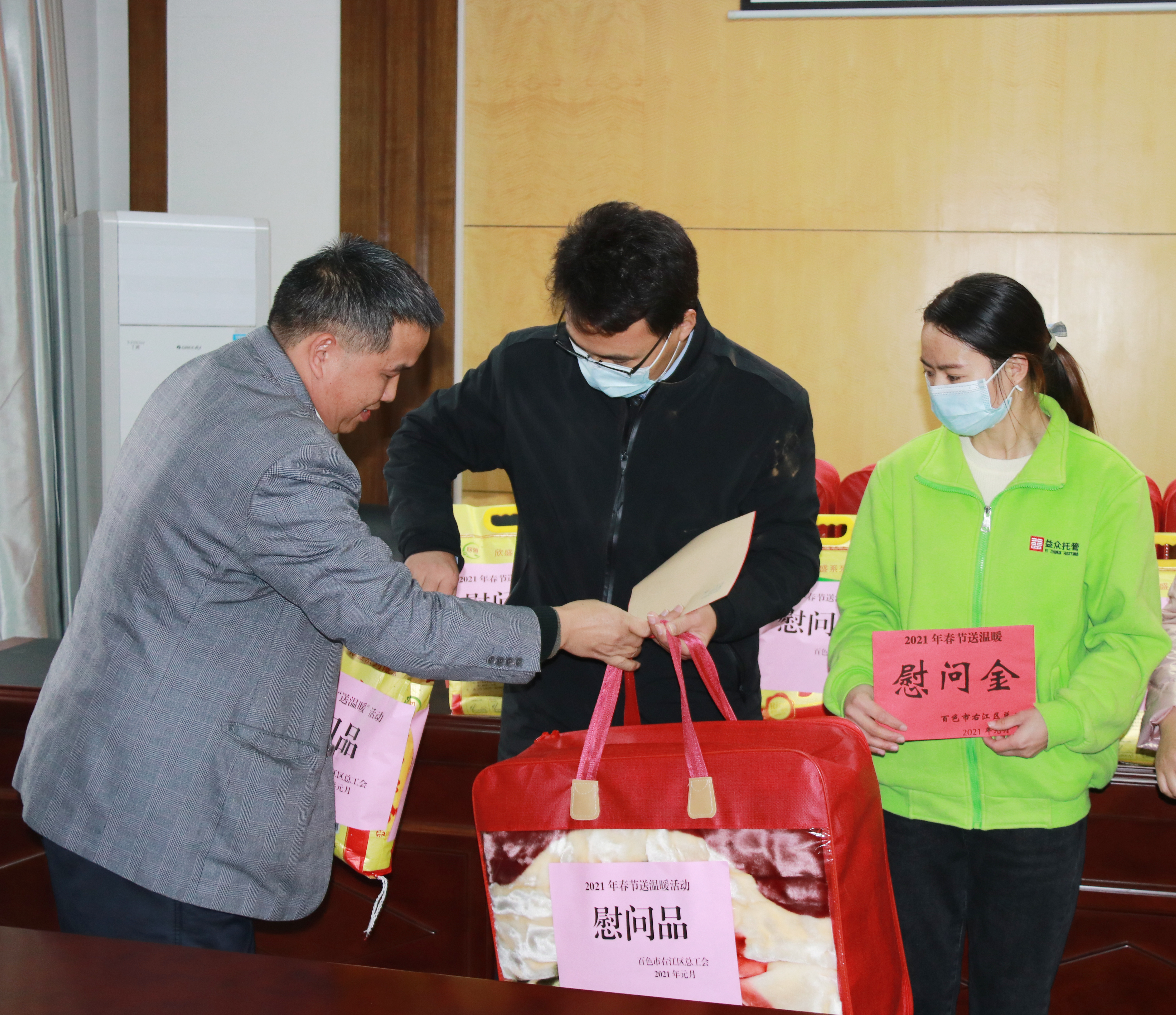 ????????1月26日下午,百色市右江區(qū)總工會黨組成員、副主席黃有路一行到益眾公司慰問廣西區(qū)外職工春節(jié)留右職工代表,把黨委政府的關(guān)懷和工會組織的溫暖及時(shí)送到職工的心坎上。