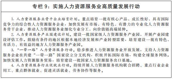 加快人力資源服務(wù)業(yè)高質(zhì)量發(fā)展。推動人力資源服務(wù)與實體經(jīng)濟融合發(fā)展,引導人力資源服務(wù)機構(gòu)圍繞產(chǎn)業(yè)基礎(chǔ)高級化、產(chǎn)業(yè)鏈現(xiàn)代化提供精準專業(yè)服務(wù)。鼓勵人力資源服務(wù)業(yè)管理創(chuàng)新、技術(shù)創(chuàng)新、服務(wù)創(chuàng)新和產(chǎn)品創(chuàng)新,大力發(fā)展人力資源管理咨詢、高級人才尋訪、人才測評等高技術(shù)、高附加值業(yè)態(tài)。實施人力資源服務(wù)業(yè)領(lǐng)軍人才培養(yǎng)計劃。開展“互聯(lián)網(wǎng)+人力資源服務(wù)”行動。深化人力資源服務(wù)領(lǐng)域?qū)ν忾_放,探索建設(shè)國家人力資源服務(wù)出口基地。