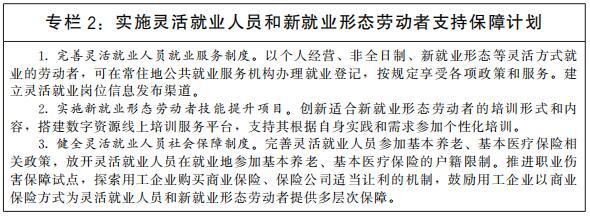 支持多渠道靈活就業(yè)和新就業(yè)形態(tài)發(fā)展。破除各種不合理限制,建立促進多渠道靈活就業(yè)機制,支持和規(guī)范發(fā)展新就業(yè)形態(tài)。鼓勵傳統(tǒng)行業(yè)跨界融合、業(yè)態(tài)創(chuàng)新,增加靈活就業(yè)和新就業(yè)形態(tài)就業(yè)機會。加快落實《關(guān)于維護新就業(yè)形態(tài)勞動者勞動保障權(quán)益的指導意見》,建立完善適應(yīng)靈活就業(yè)和新就業(yè)形態(tài)的勞動權(quán)益保障制度,引導支持靈活就業(yè)人員和新就業(yè)形態(tài)勞動者參加社會保險,提高靈活就業(yè)人員和新就業(yè)形態(tài)勞動者社會保障水平。規(guī)范平臺企業(yè)用工,明確平臺企業(yè)勞動保護責任。健全職業(yè)分類動態(tài)調(diào)整機制,持續(xù)開發(fā)新職業(yè),發(fā)布新職業(yè)標準。