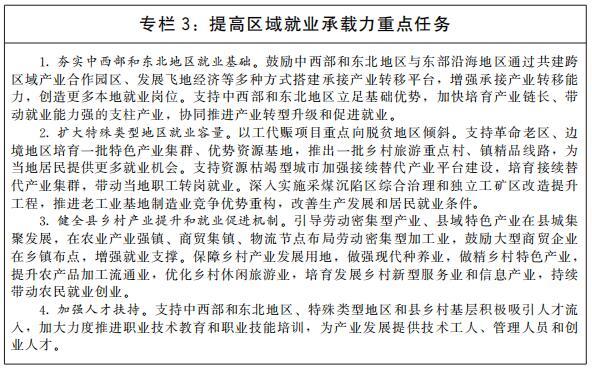 推動區(qū)域就業(yè)協(xié)調(diào)發(fā)展。支持東部地區(qū)發(fā)揮創(chuàng)新要素集聚優(yōu)勢,率先實現(xiàn)產(chǎn)業(yè)升級,開拓高質(zhì)量就業(yè)新領(lǐng)域,培育高質(zhì)量就業(yè)增長極。加快完善中西部和東北地區(qū)基礎(chǔ)設(shè)施,提升產(chǎn)業(yè)集聚區(qū)公共服務(wù)效能,引導產(chǎn)業(yè)向中西部和東北地區(qū)有序梯度轉(zhuǎn)移,推動就業(yè)機會向中西部和東北地區(qū)擴散。支持中西部和東北地區(qū)根據(jù)國家戰(zhàn)略導向和發(fā)展重點,對接先進生產(chǎn)要素和創(chuàng)新資源,發(fā)展特色優(yōu)勢產(chǎn)業(yè),改造提升傳統(tǒng)產(chǎn)業(yè),積極布局新興產(chǎn)業(yè),厚植就業(yè)創(chuàng)業(yè)沃土。