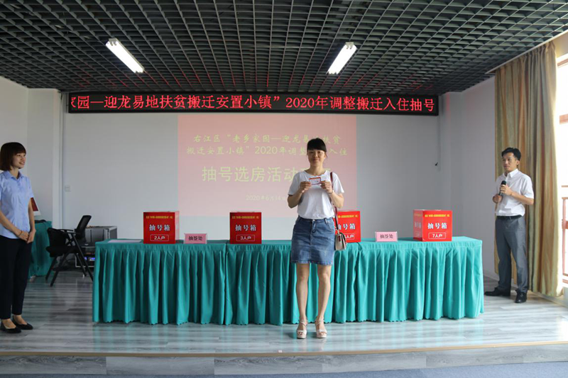 6月14日,右江區(qū)“老鄉(xiāng)家園—迎龍易地扶貧搬遷安置小鎮(zhèn)”2020年調(diào)整搬遷入住工作拉開了序幕。當(dāng)日上午,符合本次新調(diào)入搬遷對象的搬遷戶在益眾公司老鄉(xiāng)家園(益眾.尚城商業(yè)樓B1棟)辦公區(qū)舉行現(xiàn)場抽號選房、簽約手續(xù)。